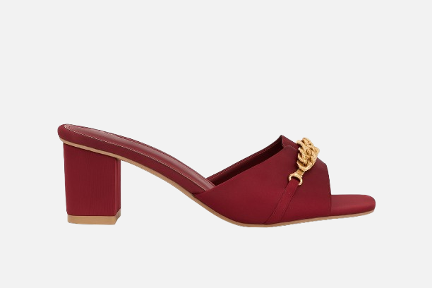 Step into captivating elegance with our Rich Maroon Block Heel Mules. The deep, luxurious maroon satin-like upper is exquisitely accented with an ornate gold-tone floral embellishment featuring sparkling ruby-red details. These sophisticated slip-ons, complete with a comfortable block heel, are designed to add a truly opulent and eye-catching touch to your most special occasions.