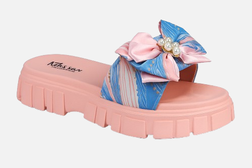 Step into delightful charm with our Sweet Pink Pearl Bow Platform Slides! These adorable and trendy slip-on sandals feature a lovely soft pink platform sole with a textured, lightweight design. The wide strap is adorned with a beautiful bow showcasing a unique blue and pink abstract pattern, centered with an elegant pearl cluster. Perfect for adding a pop of color and a touch of sweetness to your casual outfits, these comfortable slides are ideal for summer days, casual strolls, or simply brightening your look.